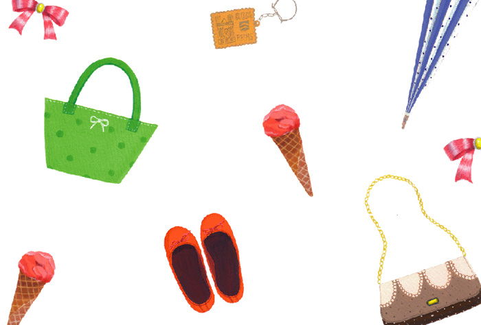 休日におしゃれする女の子をイメージして、おでかけに持っていくようなアイテムを描きました。