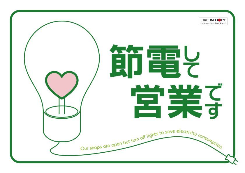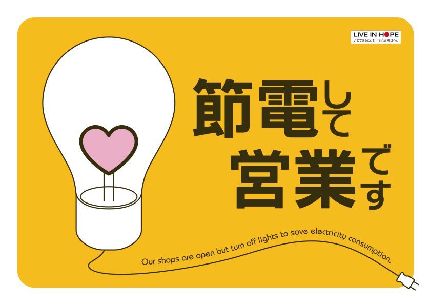 一部のお店を除いては軒並み客足が遠のいているのではないでしょうか?こうした状況のなか節電して頑張っているお店のためにポスターをつくりました。看板を消灯したり、店内の灯りを減らしたりせねばならず、営業していないように見えてしまう心配があるそうです。