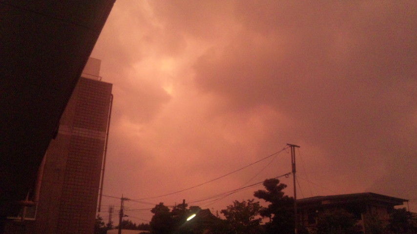 夕立の後、夕焼けに染まる赤い雲。