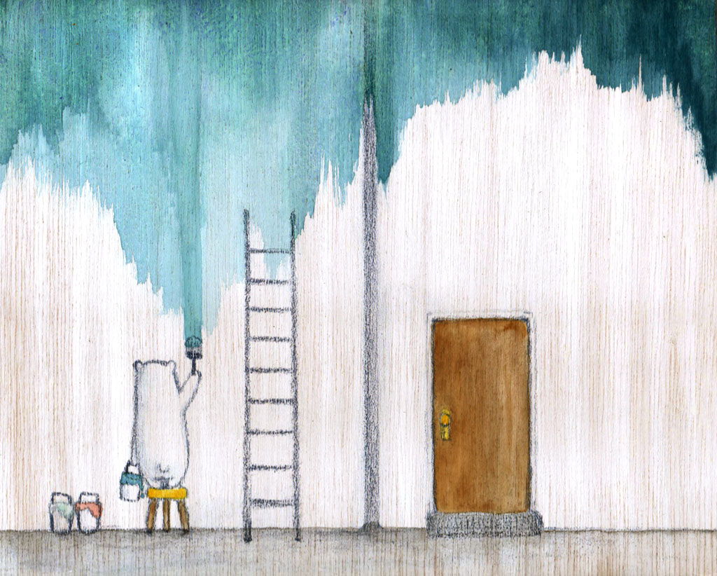 真っ白の壁を空の色に塗ってください、と頼まれた。 けれど空は変わってゆくから、朝は淡い朝焼け色を、昼は青空を、夕暮れ時には夕焼け色を塗る...きりがない。そんなしろくまのおはなしを描きたいのです。