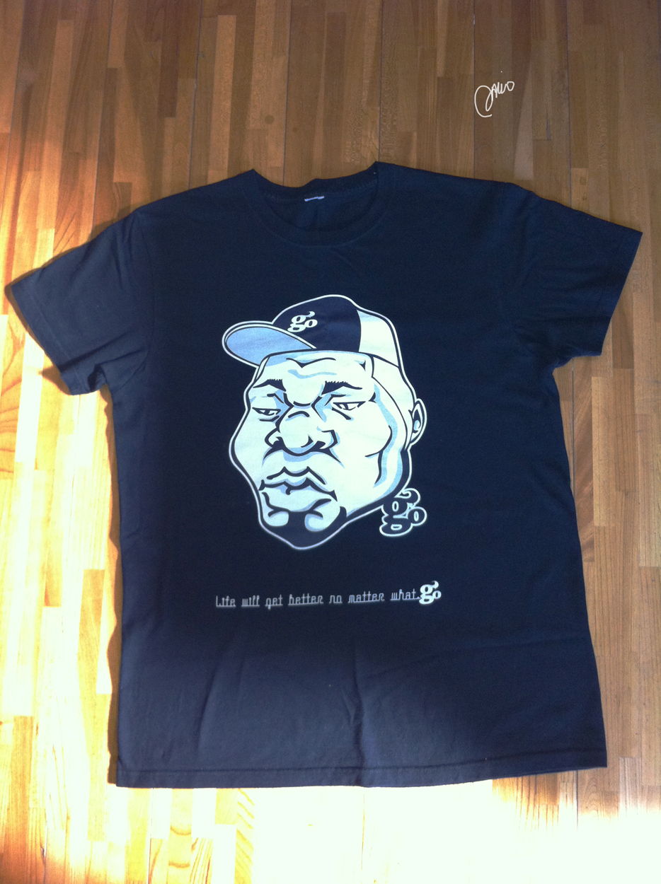 ゴツイ顔のイラストが前面に主張しているミヤモトTシャツです。こんな変なイラストTシャツ作ってます。