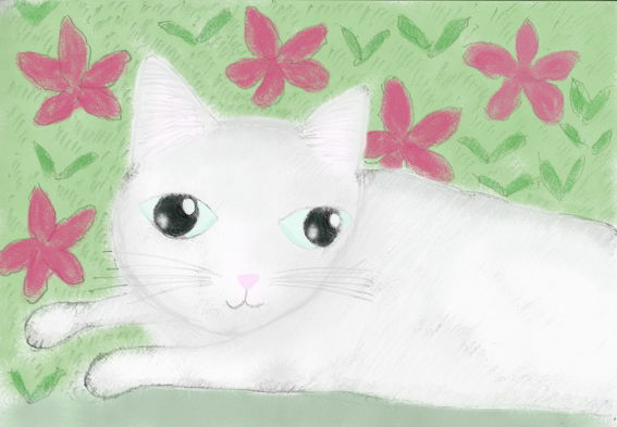 白ねこ_鉛筆とパソコンで