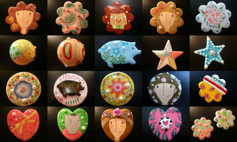 軽量紙粘土をコネコネして、クッキー型で抜いて乾かした後、アクリルガッシュで絵付けしてます。