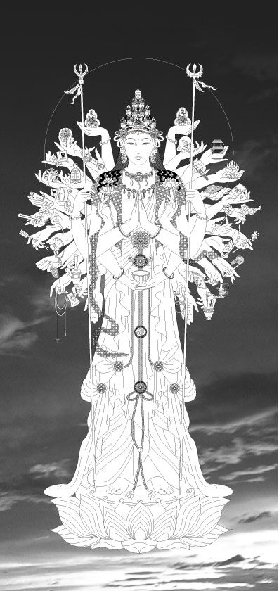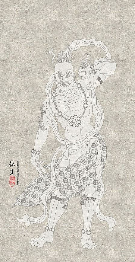 阿形像は金剛杵(しょ)を持ち、口を開け怒りの表情を顕わにし、吽形像は口を閉じ、怒りを内に秘めた表情に表わしています。