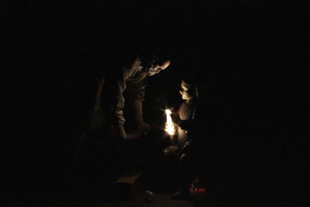 十字架を思わせる角材に穴を開けるヨセフと、それをろうそくで照らす神の子イエス。