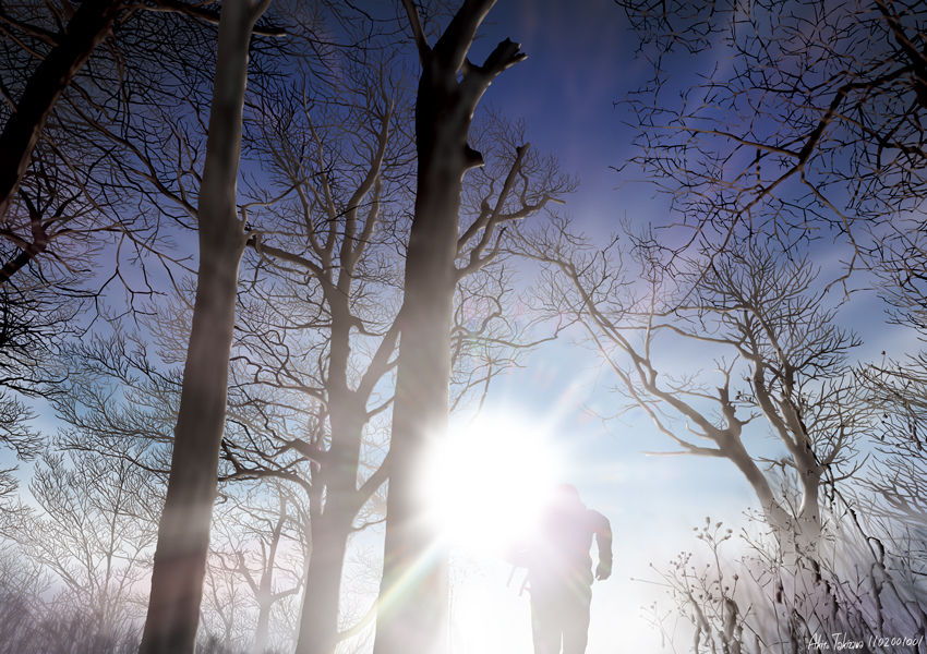 朝日を背に受けてのトレイルランです。 白い霧が晴れ太陽が顔を出してトレイルランナーの背中を押すように輝いています。光を受けてトレイルランナーは再び力を取り戻し、シングルトラックを駆け出して行きます…