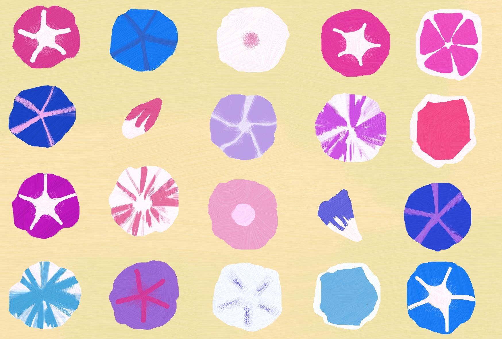 様々なタイプの朝顔を描きました。シンプルで使いやすい夏のポストカードです。