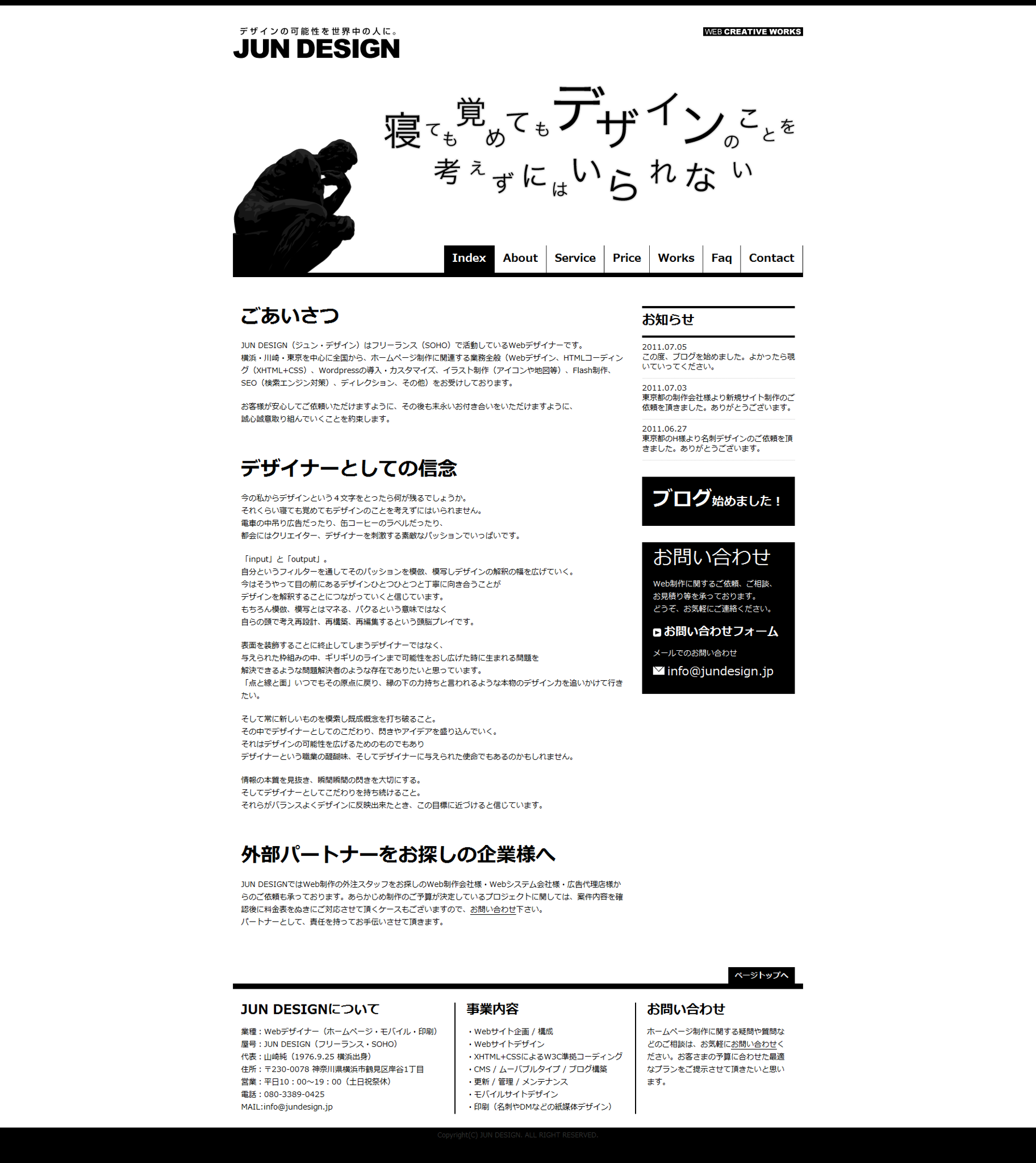 JUN DESIGN(ジュン・デザイン)はフリーランスで活動しているWebデザイナー、山崎純の個人ユニットです。 Web業界に入って10年という大きな節目を迎えました。Webという新しいデジタルツールのど真ん中にいてもアナログな人と人とのコミュニケーションを大事にできるよう心掛けています。