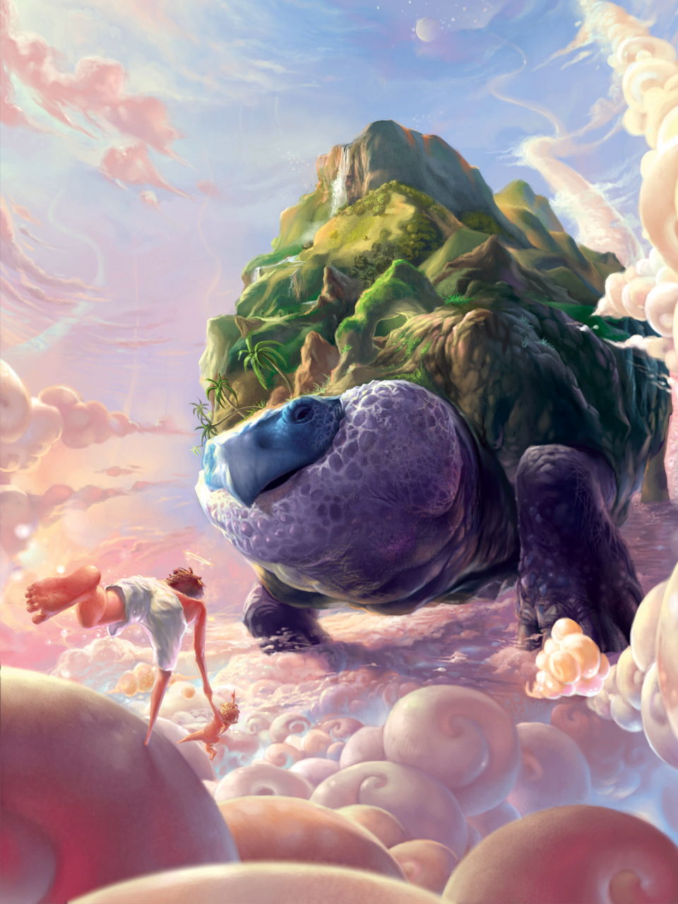The concept is about a little cupid need to go to the waterfall with his friend (maybe myself ). The waterfall is on the back of the creature (tutle + land) it's name is the World. It will come at that place one time per 86 years. So they really need to be there hehe.