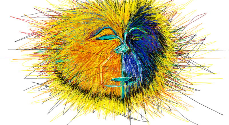 デジタルだと何度でも重ねて色をつける事が出来る。そうやって何時間も輪郭を描かずに色だけを塗っていたら、だんだんと顔の様なものが浮かび上がってきた。そう見え始めると無意識に顔にしたくなった。う~ん、何だか自分に似ている様な似ていない様な、何だかいい顔なんだけど自分であってほしくない様な、複雑な気分ですね。