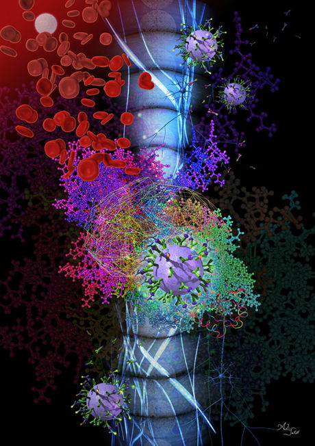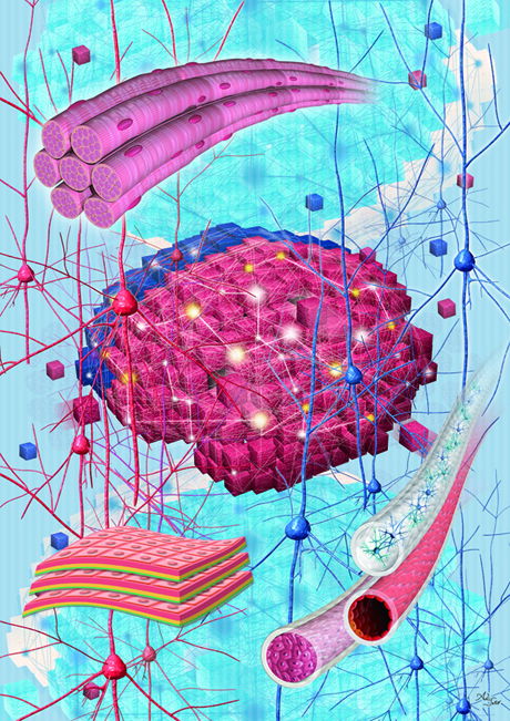 バイオテクノロジーと工学テクノロジーが融合したハイブリッドなシステムを表現しました。
