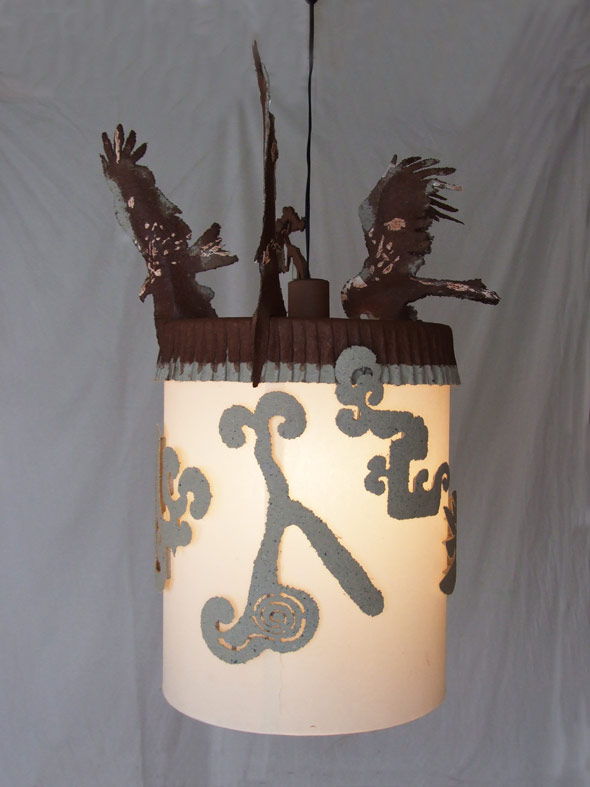 和紙円筒は直径40cm。波模様や鳶の羽などは新聞紙と和紙のヤレ紙を混ぜた再生紙を使用。