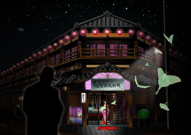 レトロで怪しくも艶かしい飛田新地の雰囲気の中に、美しい蛾(大水青)を飛ばせてみました。