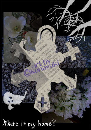 枯れ木とお化けはイラスト。背景はお花の写真。