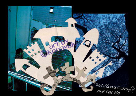 お城の切り絵の背景には 建設現場や木の写真をちょっと廃墟風な色に仕上げて。
