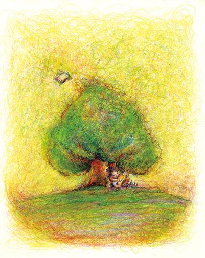 チャリティCD「空飛ぶTシャツ」(作詞・作曲バタコ http://bataco.net )によせた絵。旅する主人公と出会いの物語をイメージして。