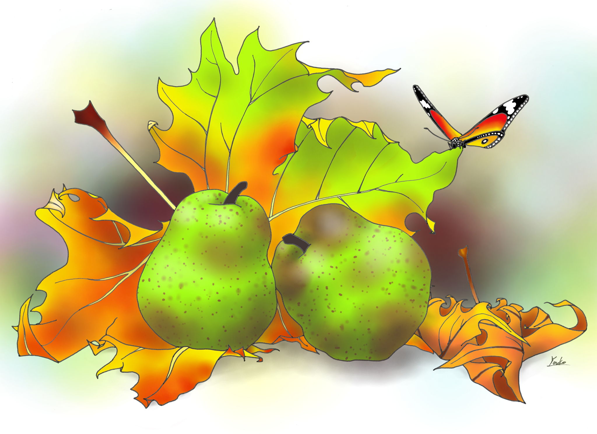 台風一過の秋を感じる高い空の下、見切り品にされた洋梨と、秋風に舞っていた大きなポプラの葉を手に入れました。ふっと目の前を爽やかな風に乗って見慣れない蝶が飛んで行きました。秋になったなぁ。