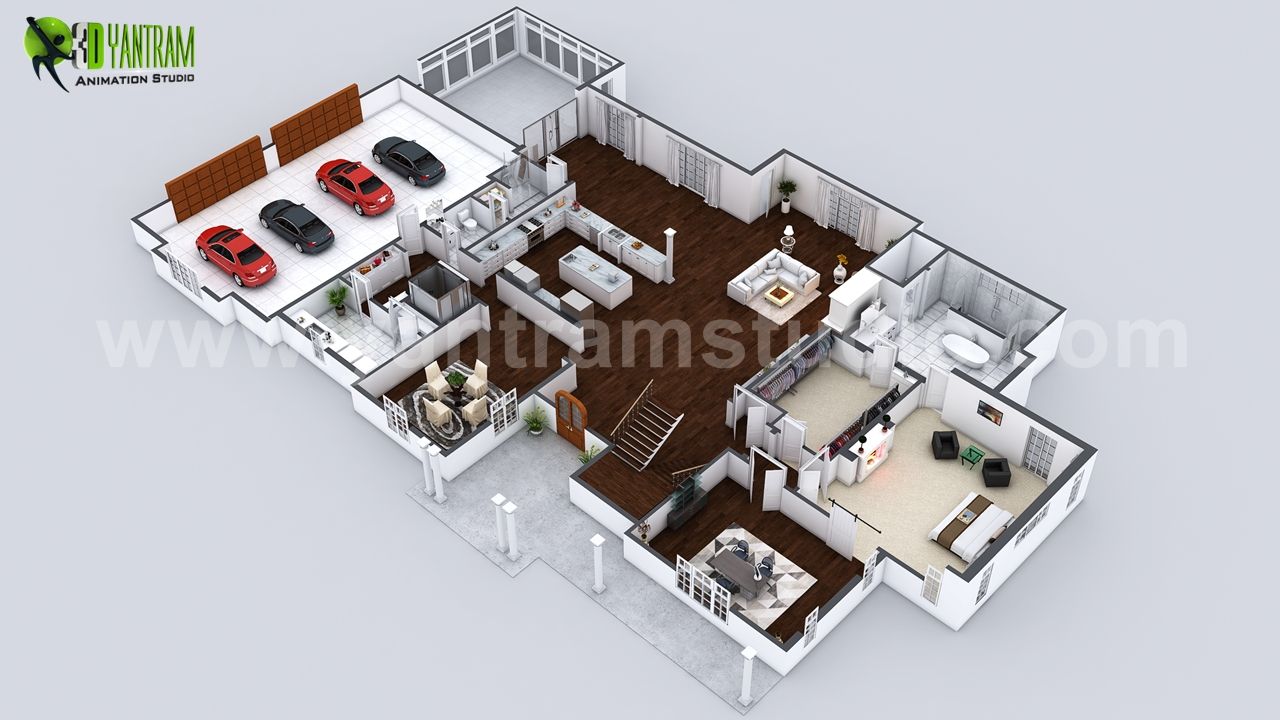 美しいモダンな3Dホームバーチャルフロアプラン、大きな駐車場付きの素晴らしいラージ3Dフロアプランのデザイン、島と白い木製家具付きの広いキッチン、特別に異なるエリアのある印象的なクローゼットルーム、白の美しいソファと装飾付きのリビングルーム、マスターベッドルームと美しい ソファ、コーヒーテーブルと白い家具、仕事用のオフィスエリア、素晴らしいダイニングエリア、白い家具付きの広いバスルーム、浴槽とシャワー付きの広いウォーク、開放的なフローリングの床、上の階の木製の階段、Yantramが開発したユニークでユニークなデザイン 建築デザインスタジオ、ロンドン - イギリス