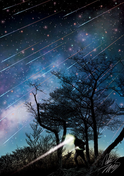 一筋、また一筋、光の尾を瞬かせて流星が遠くの稜線に消えていく…