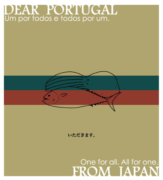 タコとマグロ // みんなは一人のために、一人はみんなのために」この諺がポルトガルにもあると知り、ポルトガルでも食べるタコと日本でも食べるマグロを一緒に描いて、日本での感謝の言葉「いただきます」に「ありがとう」の気持ちを込めました。// I learned that you also have the saying “One for all, all for one,” in