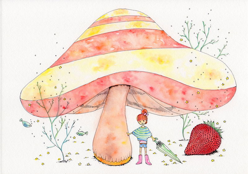 いちごが食べたい  /画材:ミリペン、水彩色鉛筆/制作年:2011年/本か何かの表紙に使える物ということを念頭に置いて描きました。  少女は星に触れてはいけません。そして水草から出る気泡がなければ生きていけません。