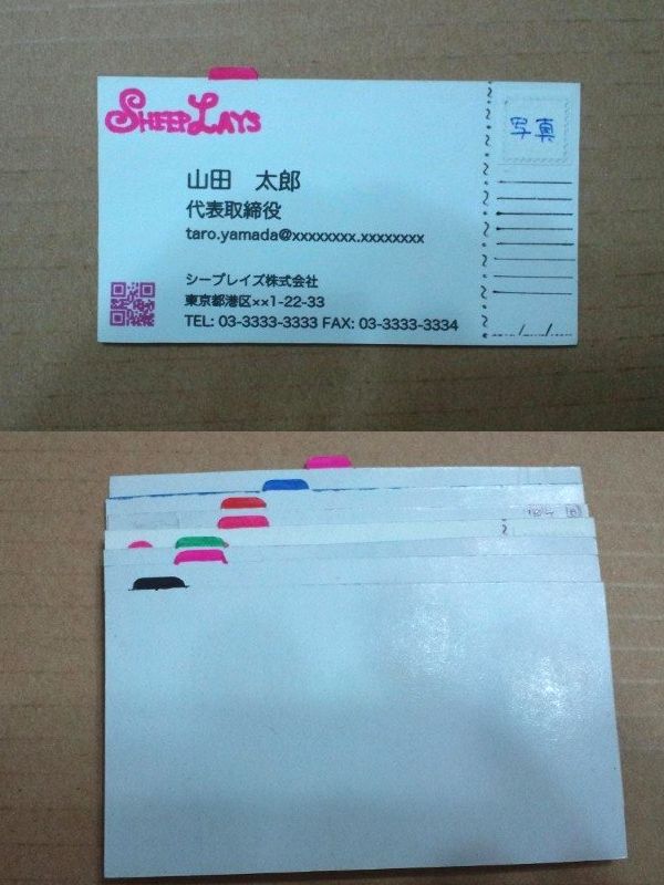 色付きのタブがついたビジネスカードです。また、絵はがきをヒントに、あえて名刺にメモと日付が記載ができるような欄を設けて、絵はがきの切手に相当する部分には自分自身の写真を掲載するレイアウトにしてみました。