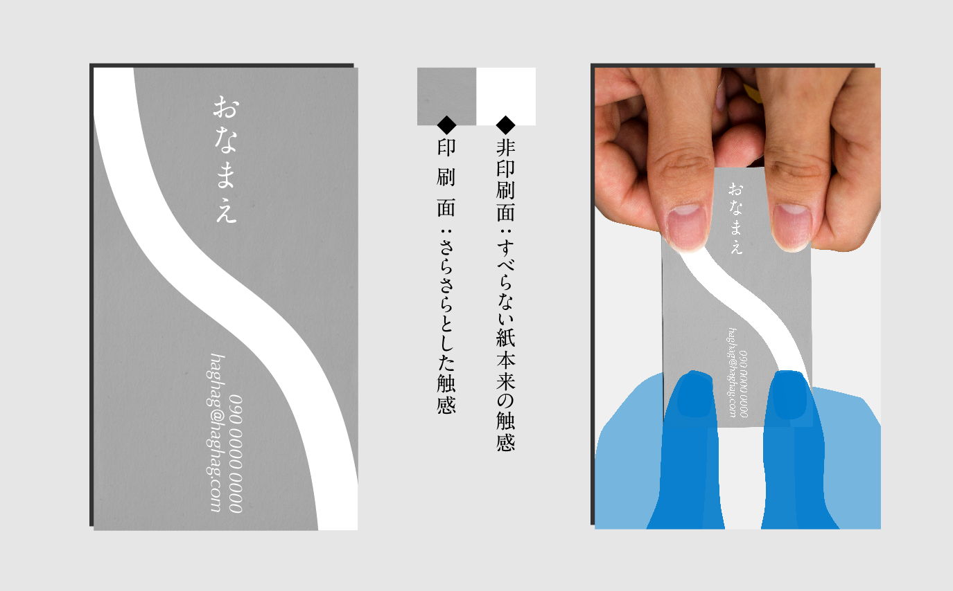 印刷の施されていない面がゴムのようにすべらないという特徴を持つ、NTS-WB8という紙を用いた名刺です。