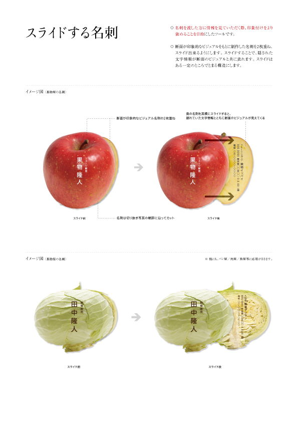 ◎ 断面が印象的なビジュアルをもとに制作した名刺を2枚重ね、スライド出来るようにします。 スライドすることで、隠された文字情報が断面のビジュアルと共に表れます。 スライドはある一定のところでとまる構造にします。