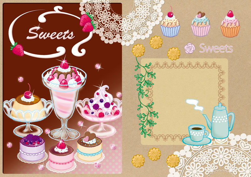スイーツのイラストです。パフェ、ケーキ、プリン、カップケーキなど…。