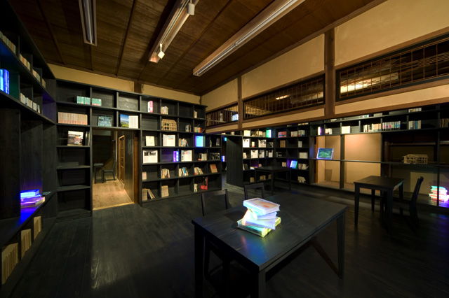 大地の芸術祭の作品のひとつともなっている地域文庫。田中文男棟梁から寄贈された図書が収蔵されています。光る本のアートはカン・アイランの作品です。