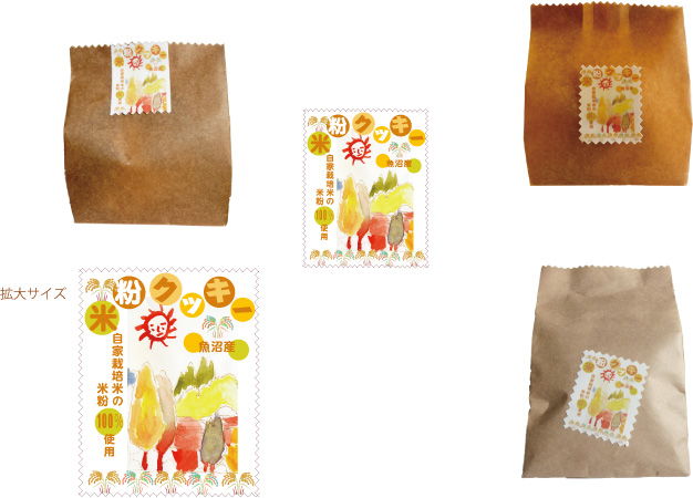 十日町のなかまの家となごみの家利用者さんの作品のやさしいあたたかいイラストでパッケージシールをデザインしました。