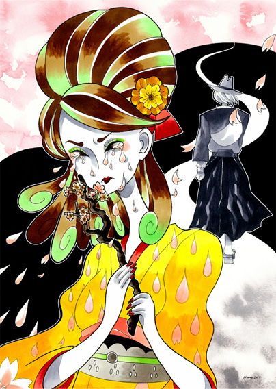 使用画材:COPICマーカー、ペン/スタイル:Myamo Style/桜Exhibition2011に出品。/春は別れの季節でもあります。恋人と別れて、悲しみにくれる女性を描きました。