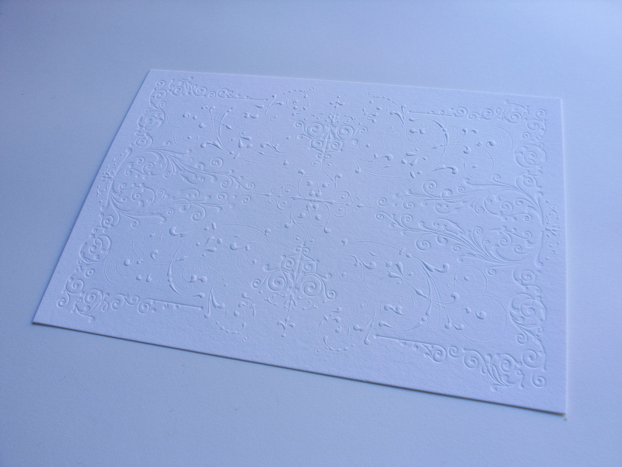 クレーンレトラという紙が2011年の12月に竹尾から発売されました。この紙、コットン100パーセントなんです!ロベールでたしか65パーセントだったっけ。最初、これスゲー!という事で先だって、紙だけ、一番分厚いのを発注し、手元にまず置いてみました。印象は、まんま「生地」だなと思いました。なんというか、紙というか「生地」。しかも、凄く清潔に保たれたイメージ。少しでも汚れてしまうと魅力が無くなってしまう、そういう印象でした。問屋さんに聞けば、そもそも、個人輸入で仕入れてる人もいるよってな事で、竹尾世代の自分としては、おお、そうなのかという具合で、ただひたすらに、コットン100がカッコよくて、めずらしい感じがしました。ただ、これ、色々と調べていく内に分かったんですが、活版用に最適化された紙なのだそうで、重要な書類、小切手やパスポートに使用される、超高級紙だったのです。たしかに、買った時、オフホワイトとスノーホワイト、全紙1枚ずつ買いましたが、べらぼうに高い値段でした…。そこで、今回、「PRINTERS'FLOWERS from エンスヘデ活字鋳造所」を使用した、エンボス&デボスを行いました。グラフィックデザインを施すというよりも、より、クレーンレトラというコットン100の紙を「紙」として見せる事が出来るのかに着目し、設計をしました。なんというか、この紙は、まず、存在が完成しているんです。それが既に完成されているもんだから、付け入る隙が無いのです。「目的」があって初めて完成を見るものでもあるし、今回のように、素材を目的とした加工においては、非常に難しいものを感じました。クレーンレトラにこのような加工をするに至っては「PRINTERS'FLOWERS from エンスヘデ活字鋳造所」は線が非常に細いので、平和紙から出てるディープマットのような固いしっかりとした紙のように、くっきり出ないであろうと予想していました。正直、予想なんて出来ず、これはもう加工する職人さんの腕の善し悪しで決まってくるんだろうなとモヤモヤしつつだったんですが、結果、なんとも、紙、というよりも、それこそ「生地」のような柔らかくも、ホント、これが驚いたんですが、こんなに、しなやかで優しい手触りなのに、くっきりと細い線が出ていたのです。しかも、柔らかく出ていたんですね。なんというか、フワっと押した感じです。どちらがいいという話ではないですが、ディープマットとは、まったく違う方向なんだなと感じました。むしろ、紙という感覚さえも無くしてしまうような気さえしてしまいました。これホント、紙と同じ気分で使ってたら火傷するかと思います。これはこれって感じ。技術的な概念が少し考え方が違うと見た方がいいかもです。下手したら紙負けしちゃうので、逆らっちゃあ、マジ危険で恐い。んですが、その反面、全てを委ねる事が出来るぐらいにスッゲー安心感がある。なんかこう、支持体が違う感じです。何度も繰り返し塗ると紙だとふやけてしまいますが、麻や綿だと、何度も塗り直す事が出来る。そんな支持体への安心感に似たものがあります。扱ってみて、とんでもない紙が販売しちゃったなという感じがします。これを使いこなせる人は果たしているのか!?なんというか使いこなしている所を見てみたいです。僕も今回、頑張ってみましたが、果たしてどうなのか!?少し逃げ腰でしたが、紙そのものの魅力は引き出せたような気がします。是非!仕事で、目的のある印刷で使ってみたいなあ。