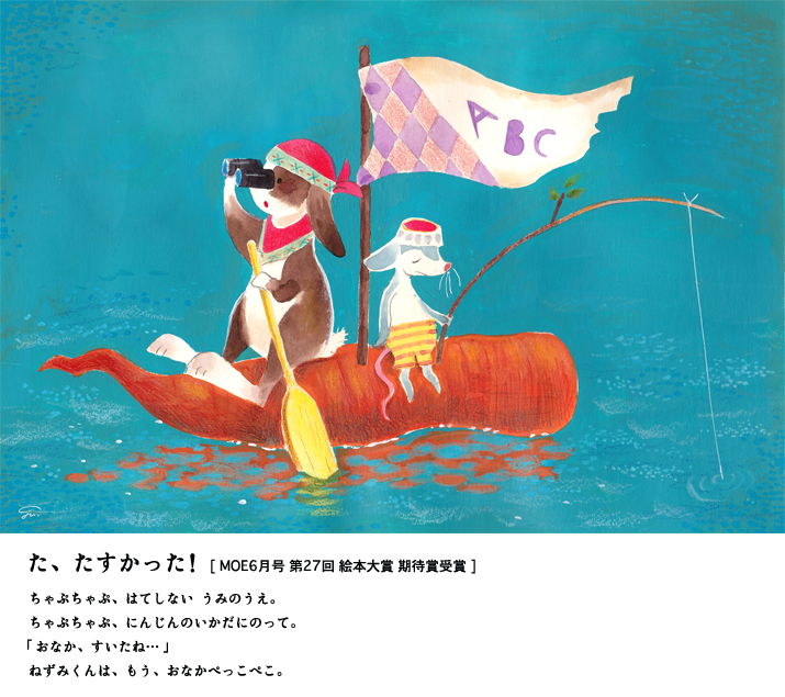 果てしない海の上。にんじんのいかだに乗った、お腹がぺこぺこなうさちゃんとネズミくん。ネズミくんが取った行動にうさちゃんはビックリ!4見開きのショートストーリーです。 MOE6月号第27回絵本大賞 期待賞