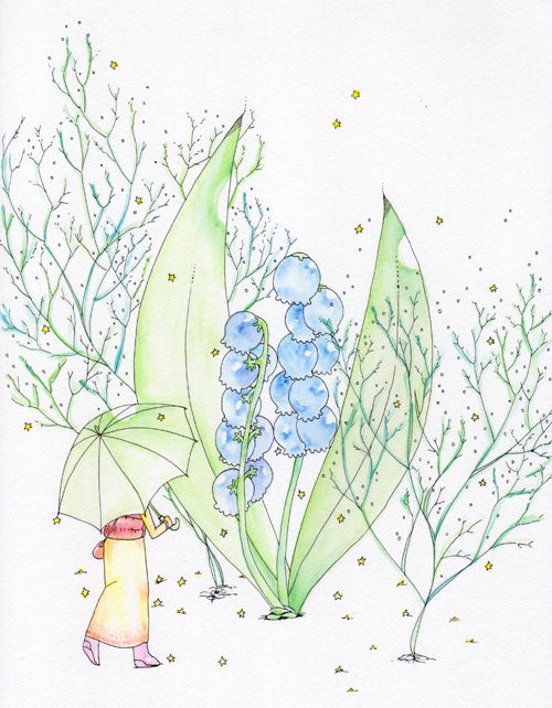 鈴蘭っぽい花 /画材:ミリペン、水彩色鉛筆/制作年:2011年/本か何かの表紙に使える物ということを念頭に置いて描きました。  少女は星に触れてはいけません。そして水草から出る気泡がなければ生きていけません。