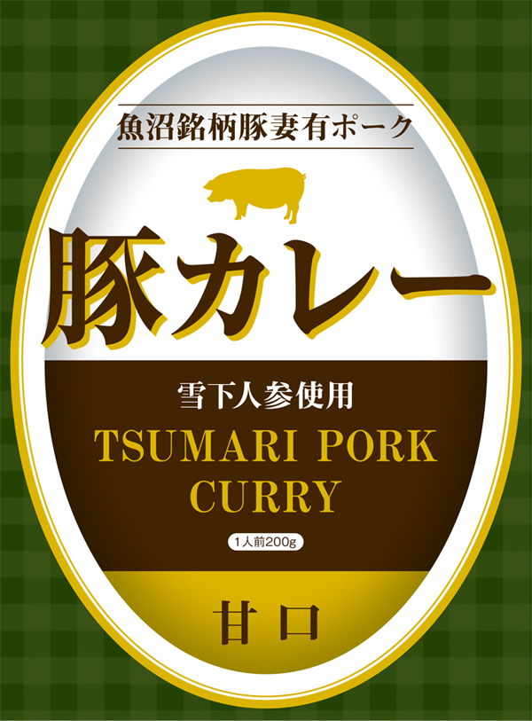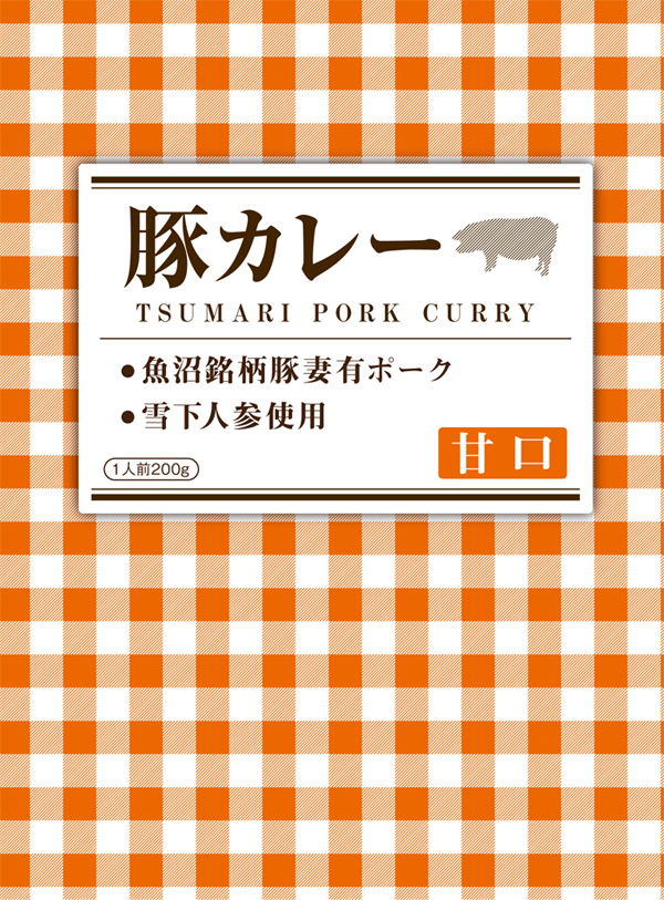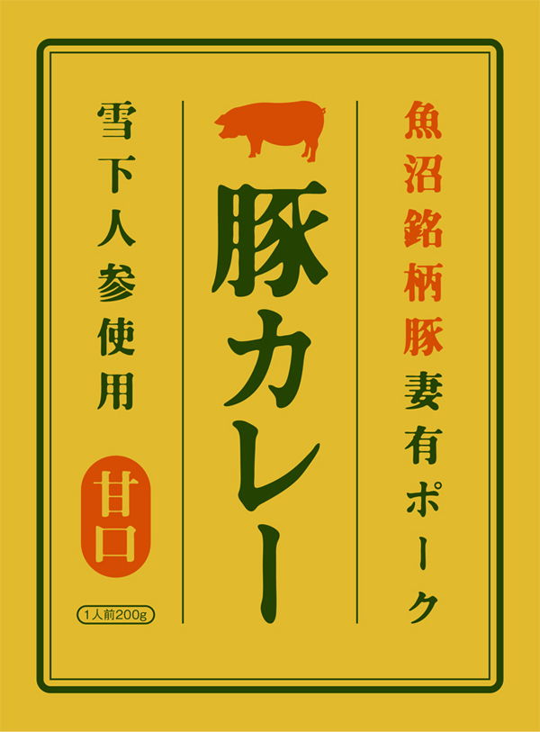 選り抜きの素材たちが一枚のお皿に納まって『豚カレー』を作り上げている、その様子をそのままデザインの中心に据えました。現行のパッケージでは、商品名と原材料が文字情報として間違いなく判読できる反面、それ以外にカレーを示す要素が不足しています。『お皿またはご飯の“白”とカレーの“茶色”のコントラスト=この商品はカレーである』という情報を、デザインに乗せてより前面にアピールするという狙いのもと制作しました。