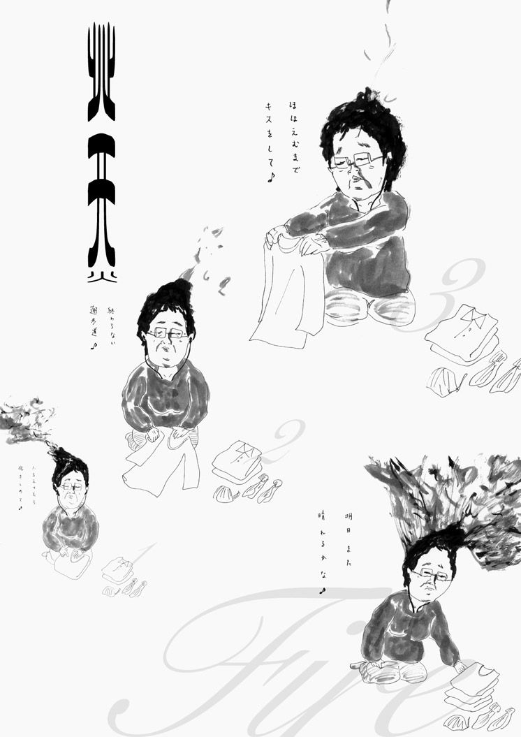 むかし新聞配達をしていたころ、早朝6時に必ず見かけるおばちゃん(50歳くらい)がいて、毎朝玄関前をすごく早口の大声で怒り狂いながら猛然と掃除をしていたのを、ふと思い出した。とにかくそのおばちゃんはイライラしていて、『なんで毎日毎日わたしがこんなんせなあかんの!』とかいいながらすごくキビキビと掃き掃除や水打ちをしていく。ぶつぶつ文句を吐きながら朝顔を手際よく手入れしていく。花は毎朝文句を聞きながらも美しく咲き誇っていた。今 思えばおばちゃんは怒りをモチベーションの維持に変えていたのかもしれない。/他の作品は下記サイトでもご覧になれます。 本日のアトオシ http://today.atooshi.com/