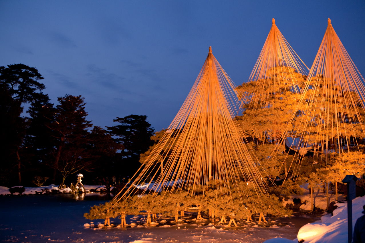 Kenroku Park, the famous sightseeing spot in Kanazawa in February. Illuminated trees placed ropes or wires around to protect them from the snow; ropes are stretched from the top of a tree to the lower branches to prevent their breaking.