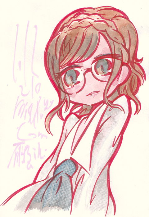 たまにHPで公開してる町で見かけた女の子をモチーフにしたスケッチです。いつも24枚つづりのスケッチブックにサインペンと絵の具で書いてますが僕の塗り方はみずっけが多く薄いせいかスキャナで取り込むときに色が飛んじゃうことがままありますよ