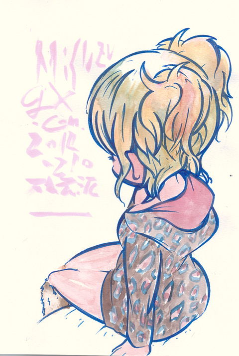 たまにHPで公開してる町で見かけた女の子をモチーフにしたスケッチです。いつも24枚つづりのスケッチブックにサインペンと絵の具で書いてますが僕の塗り方はみずっけが多く薄いせいかスキャナで取り込むときに色が飛んじゃうことがままありますよ