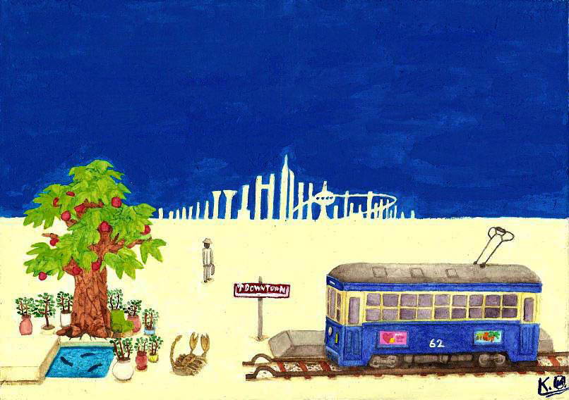 B5サイズ(182×257)のパネル・水彩紙に空・地表の部分はアクリルで、それ以外のモチーフ類は水彩絵の具で描いたもの。「遥か向こうに見えているもの」が果たして桃源郷なのか、それともただの幻に過ぎないのかどうかは当方の与り知らぬ所。