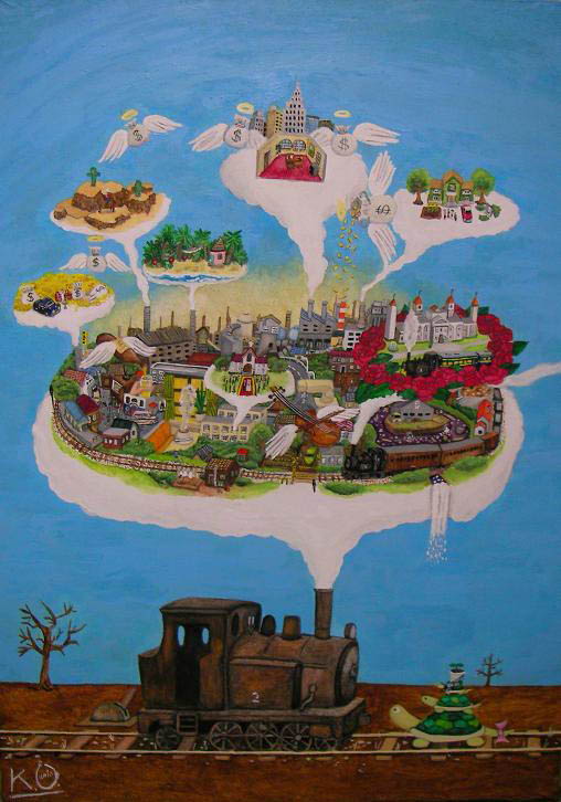 A2(420×594)のパネル・水彩紙に空をアクリルで塗った以外は、水彩絵の具で塗ったもので、2010年の「下北ギャラリー」での合同展に出展するために描いたもので、「蒸気機関車の煙が吹き上げる思い出」のさらに上に「そこで暮らしていた/働いていた人達が見ていた夢/野望」を重ねてみました-ついでに言うと「語り部」の蒸気機関車にも夢と言うか野心があった...と言うか。