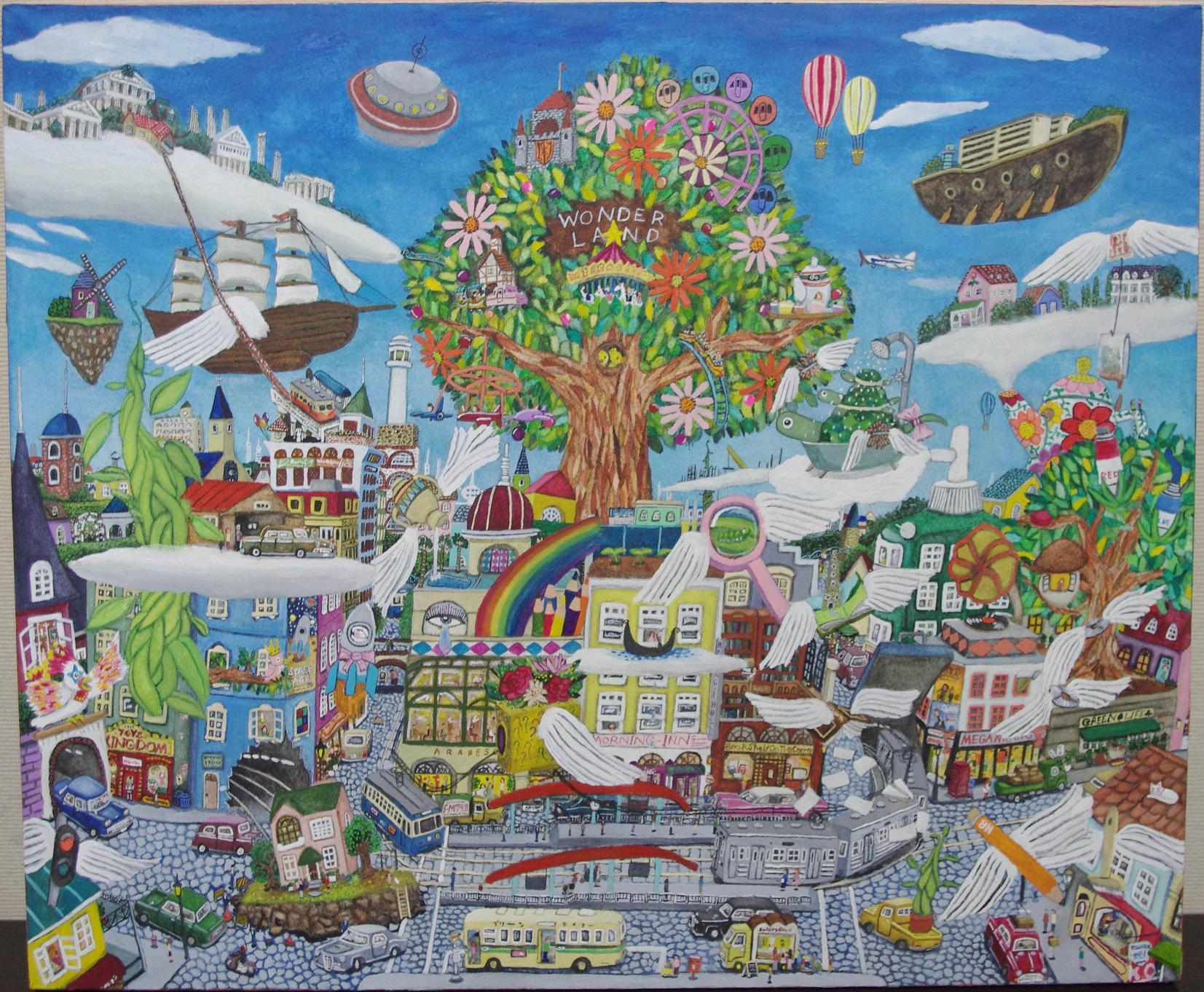 F8(455×379)サイズのパネル・水彩紙に水彩絵の具を塗ったもので、2010年の11月に名古屋のギャラリー「INTROART(インタラート)」さんで開催された「inside out」展に参加するために描いた絵もの自分が昔好きだったものや色、(記憶違いでなければ)持っていたもの、それから最近になって思いついたものの混合体。
