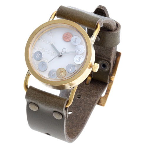 数字のチップは、1・2・3・4・6・7・8時の位置、12時の位置、5時の位置で、それぞれ異なる素材を用いられており、配色のバランスがお洒落な雰囲気。ブランド名<dedegumo>を特徴的にデザインした刻印と、ブランド名の“gumo”をもじって“蜘蛛”の絵の刻印が施されています。
