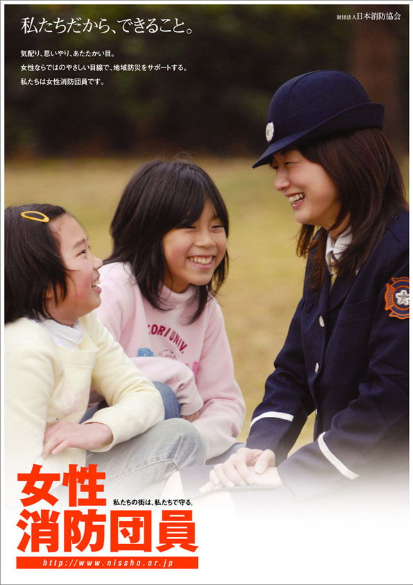 火災現場ではなく、地域で身近な活動を行う女性消防団を全面で表現。