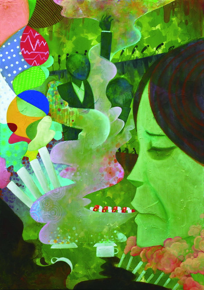 ※無断使用、商用、加工禁止※ 甘い・すっぱい・しょっぱい・辛い・苦いの5つの味覚を視覚表現した作品です。それぞれのテーマカラーやメインになっている人物の表情だけではなく、小物からもに味覚を読み取れるように格言などを参考にして作成しています。  使用画材…アクリル絵具 作成サイズ…B2