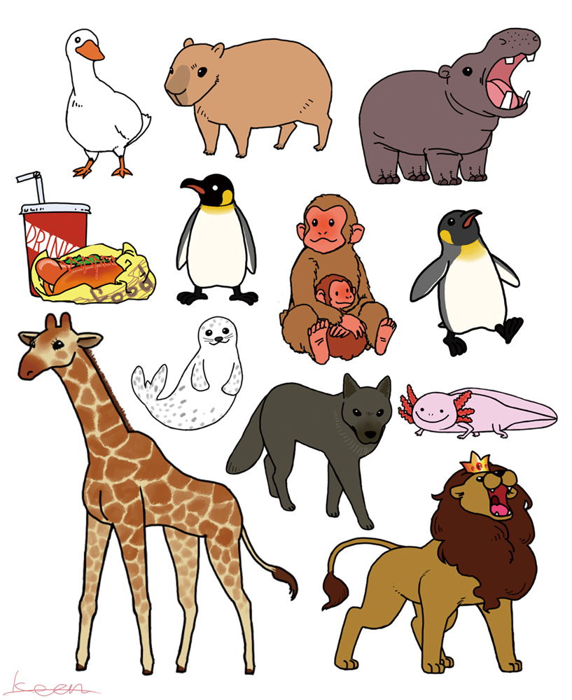 ※無断使用、商用、加工禁止※ お仕事で作成した動物園のイラストカットです。別に作成した動物園のMAP上に動物のイラストを置いて使いました。ホットドックとドリンクは園内のフードサービスコーナー用に作成しました。