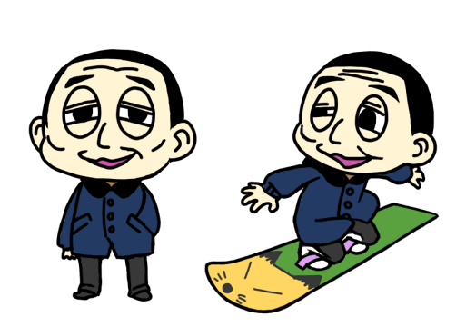 ※無断使用、商用、加工禁止※ 俳優の田中邦衛さんが『北の国から』で演じた黒板五郎をデフォルメキャラクター化し、スノーボードをしているイラストです。より『北の国から』らしさを出すための工夫としてスノーボードにキツネの顔を描きました。