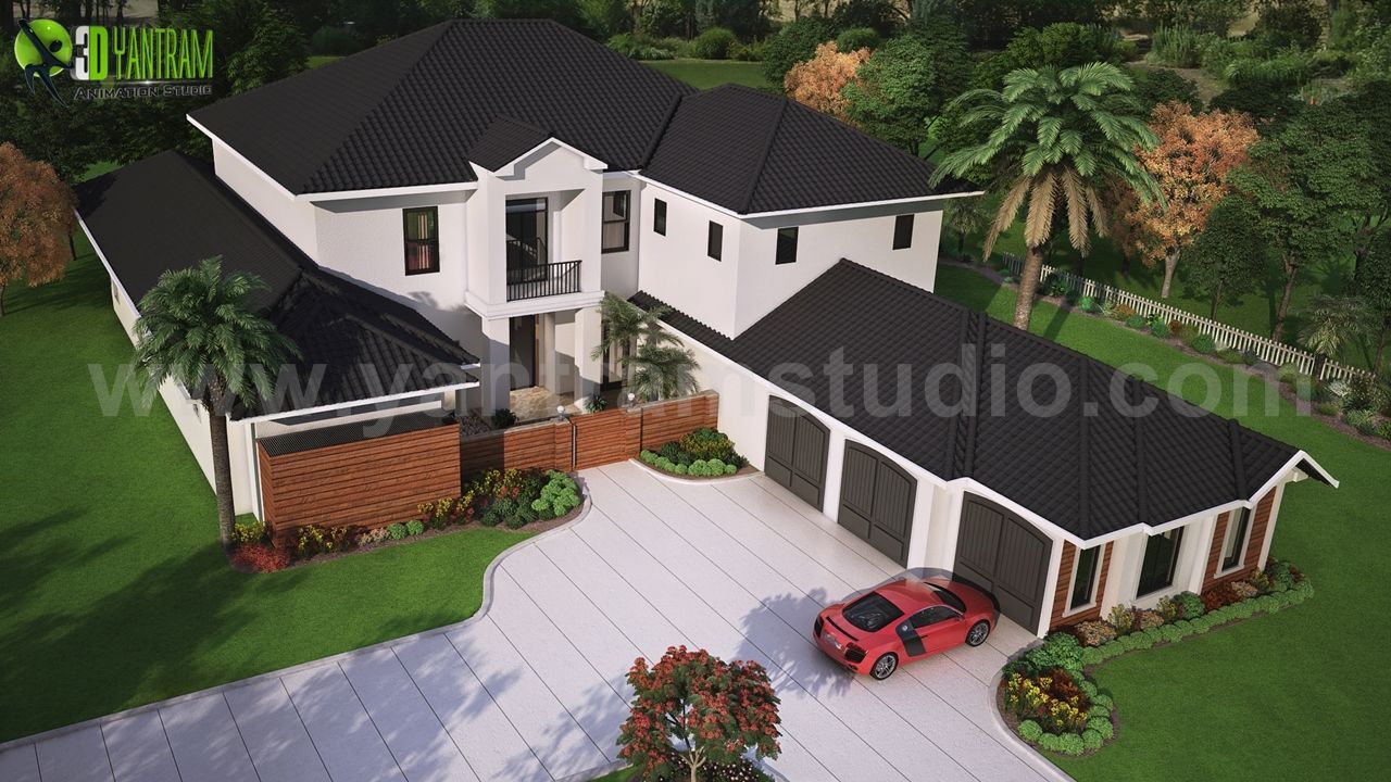Awesome Home Architectural Rendering Studio with White exterior and brown metal roof modern luxury house and front beautiful door, blank house, estate, driveway, estate, facade, front garage, garden, grass, tress, spaces balcony, window, home, ornamental door, lifestyle, real residential, sidewalk, suburb, top view structure, wealth, atmosphere, lawn, brick building by Yantram Architectural Studio