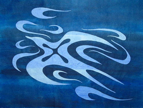 B2大ほどのサイズ。北斎が使った「ベロ藍」と同じような色の顔料を使用。一種類の顔料だけで色の深みがどれくらい出るものか実験した面もある。この顔料は染料のインド藍にも似た色で、薄く出せば爽やかな空色、濃く重ねれば深い宇宙の青が出る。最も気に入って多用している色。